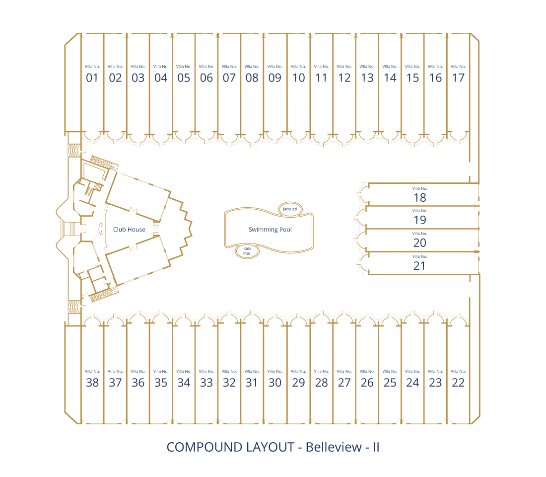 Belleview- II is a contemporary residential compound built to an extremely high standard of Spanish Design Elevation that offers unsurpassed comfort and services in a setting of architectural grandeur. The villas are decorated in the latest haute couture fashion with patterned corniches, inserted panel ceilings and classic chandeliers.
