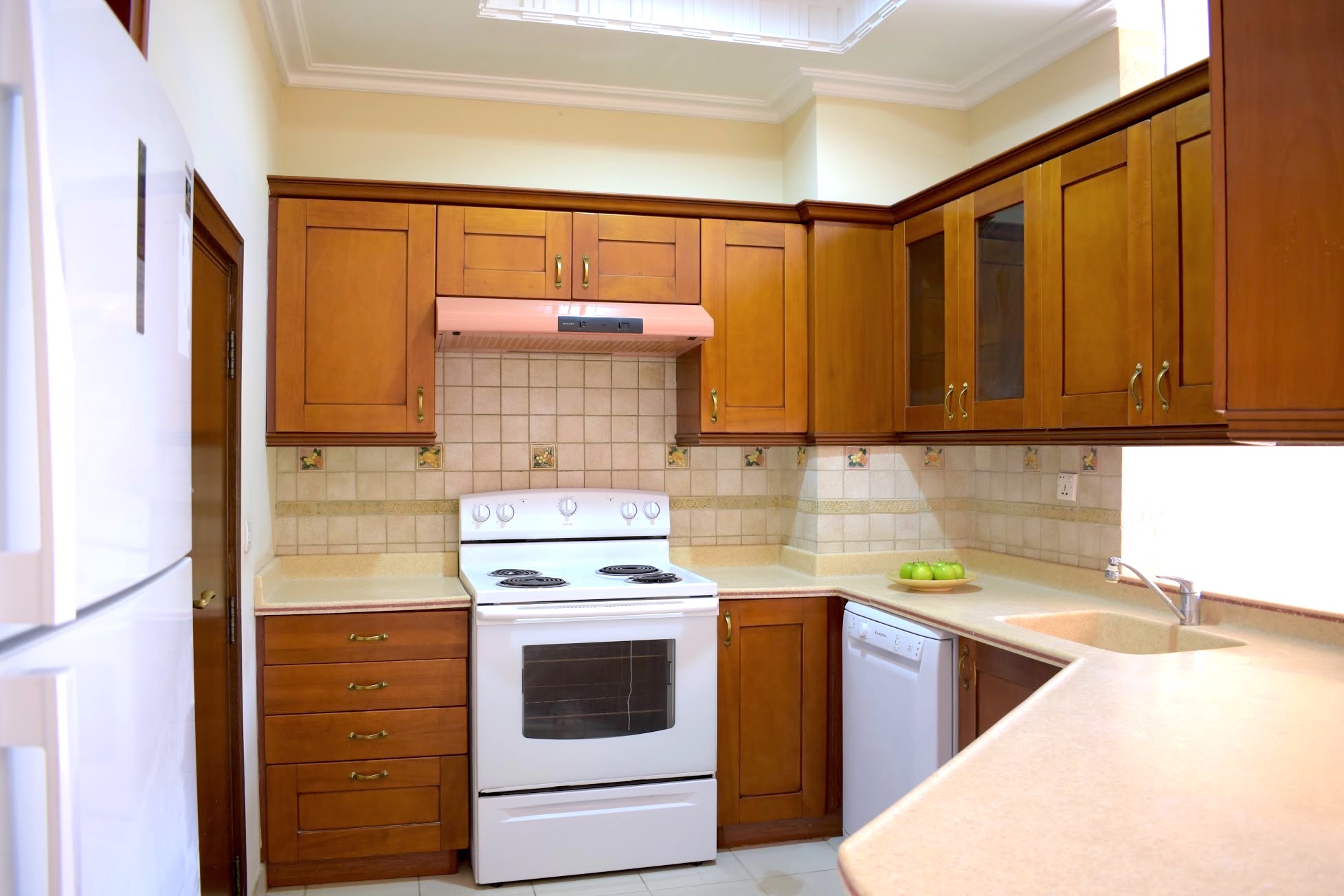 *Cooker-oven including hood, refrigerator, freezer, dishwasher, microwave, breakfast table, bar stools and storage cupboards with built-in CD Player.Register Interest